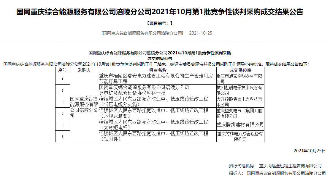 恭喜我司中標國網重慶綜合能源服務有限公司涪陵分公司2021年10月第1批競爭性談判采購