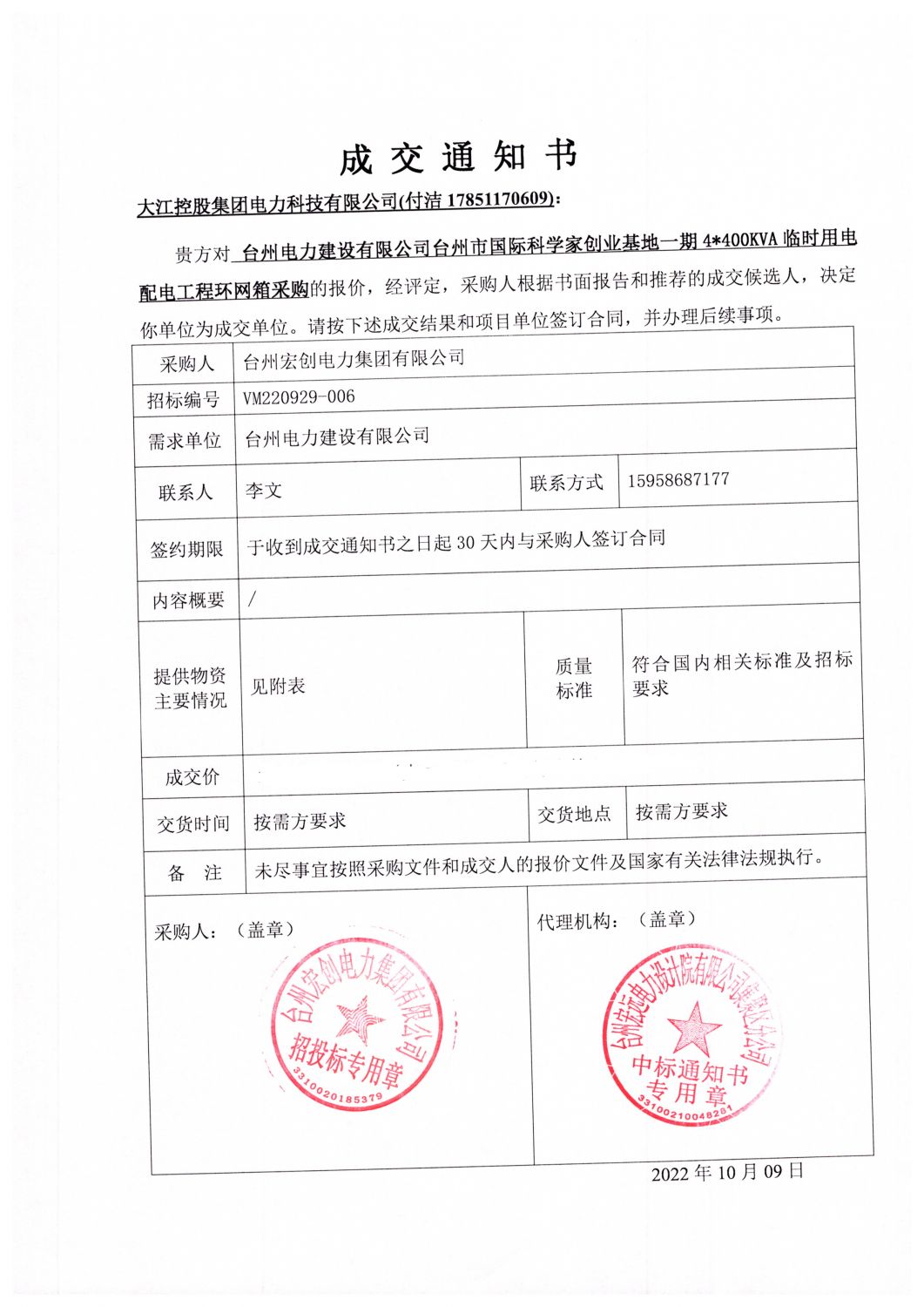 2022年10月9日,我公司在宏創集團2022年9月第五批物資采購中,憑借過硬的產品質量,紮實高效的工作作風、卓越的團隊服務和良好的企業信譽,以絕對的優勢順利中標,項目單位為:台州電力建設有限公司台州市國際科學家創業基地一期4*400KVA臨時用電配電工程,中標物資為:環網箱包1標段。