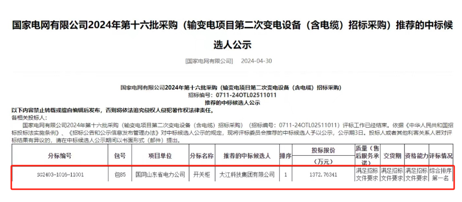 【喜報】豪运国际科技集團成功中標國家電網有限公司總部2024年第十六批采購開關櫃項目