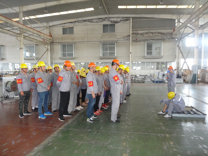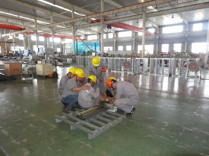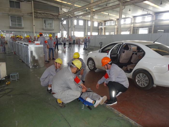 本次應急演練力求真實,演習場所放在櫃體車間裝配工位,現場模擬在進行航吊搬運物品時,將正在進行裝配的員工腿部撞傷。