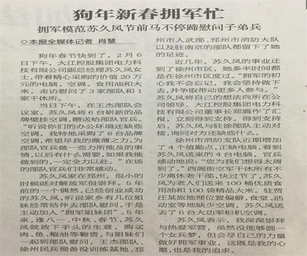 2018年2月,副總經理蘇鳳久懷著從(cong) 小對解放軍(jun) 的崇拜之情,帶著精心采購的價(jia) 值20萬(wan) 元的禮品走訪了市區三家部隊和1家幹休所,這一舉(ju) 動得到了公司領導的鼓勵和支持,副總經理表示,我雖然沒能圓一個(ge) 女兵夢,但是一定會(hui) 將這份擁軍(jun) 事業(ye) 進行到底。