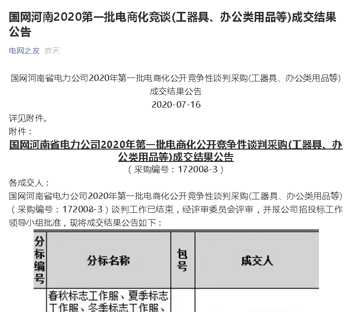 恭喜我司中標國網河南省電力公司2020年第一批電商化公開競爭性談判采購